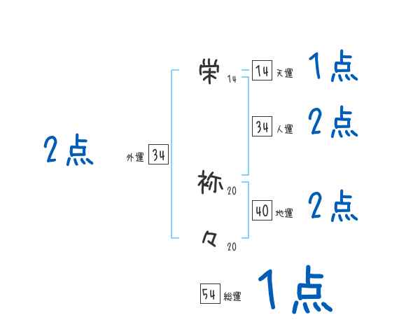 天運![]() | 栄袮々さんの天運は14画の1つ星!人に対して優しいがストレスを溜め込みがち。人間関係のトラブルを避けるよう気をつけましょう。 家系が持つ宿命的な運勢を表します。祖先から受け継いだ苗字ですので自分の力が及びません。家柄を象徴します。 |