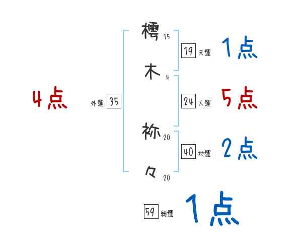 総運![]() | 樗木袮々さんの総運は59画の1つ星!意志の弱さであきらめることが多いかも。粘り強さが必要。 あなたの人生を表す1番重要な運勢です。生涯を通じて影響する総合運となり、主に50歳以降の晩年期に影響を及ぼします。 |