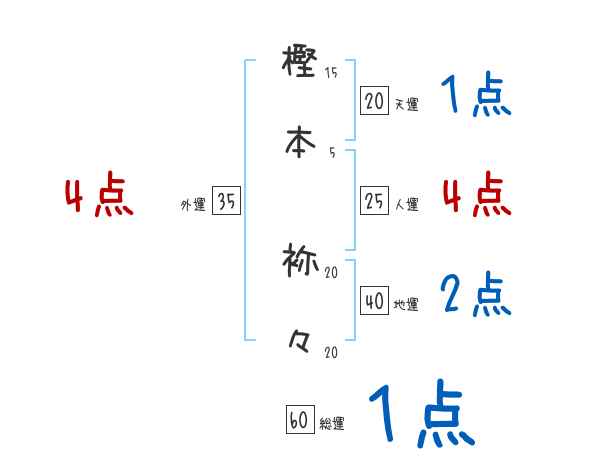 外運![]() | 樫本袮々さんの外運は35画の4つ星!温厚な性格で感受性が高い。穏和な性格で人望が厚い。 生活面を象徴する運勢です。外部から受ける影響力を表し、結婚運、家庭運や職場、環境への順応性を表します。 |