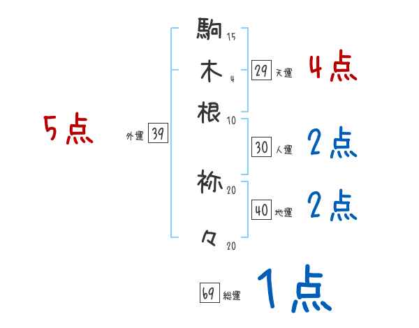 外運![]() | 駒木根袮々さんの外運は39画の5つ星!社交性に優れ人望が厚い。人の上に立ち成功する。 生活面を象徴する運勢です。外部から受ける影響力を表し、結婚運、家庭運や職場、環境への順応性を表します。 |