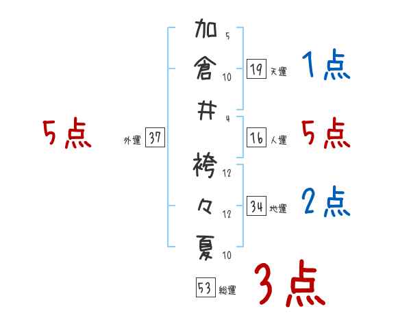 人運![]() | 加倉井袴々夏さんの人運は16画の5つ星!人望が厚く大きく発展する。逆転成功が見える。 性格や才能などを表す2番目に重要な運勢です。人間関係や協調性、社会的な成功に影響します。主に20歳から50歳ぐらいまでの中年期の運勢を表します。 |