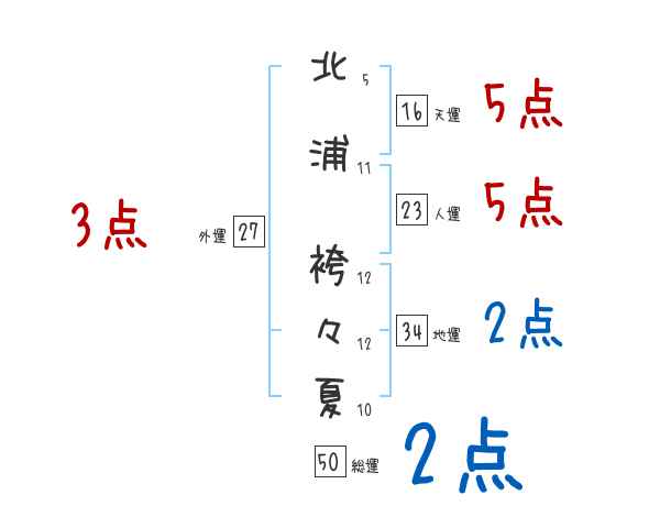 天運![]() | 北浦袴々夏さんの天運は16画の5つ星!人望が厚く大きく発展する。逆転成功が見える。 家系が持つ宿命的な運勢を表します。祖先から受け継いだ苗字ですので自分の力が及びません。家柄を象徴します。 |