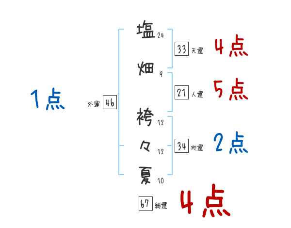 天運![]() | 塩畑袴々夏さんの天運は33画の4つ星!権力志向でプライドが高い。勇気があり運を切り開き成功する。 家系が持つ宿命的な運勢を表します。祖先から受け継いだ苗字ですので自分の力が及びません。家柄を象徴します。 |