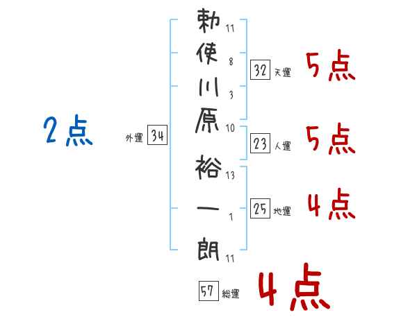 天運![]() | 勅使川原裕一朗さんの天運は32画の5つ星!柔軟性があり成功する。チャンスが多く金運が良い。 家系が持つ宿命的な運勢を表します。祖先から受け継いだ苗字ですので自分の力が及びません。家柄を象徴します。 |
