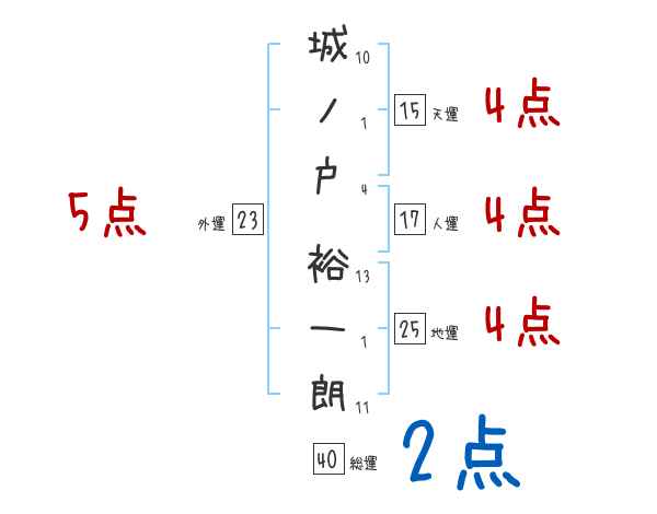 外運![]() | 城ノ戸裕一朗さんの外運は23画の5つ星!想像力に優れ活力がある。一代で成功し名誉を手に入れる。 生活面を象徴する運勢です。外部から受ける影響力を表し、結婚運、家庭運や職場、環境への順応性を表します。 |