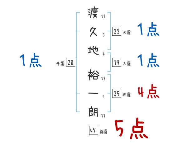 天運![]() | 渡久地裕一朗さんの天運は22画の1つ星!努力することが苦手ないっぽう手先が器用。芸術性にも優れる。 家系が持つ宿命的な運勢を表します。祖先から受け継いだ苗字ですので自分の力が及びません。家柄を象徴します。 |