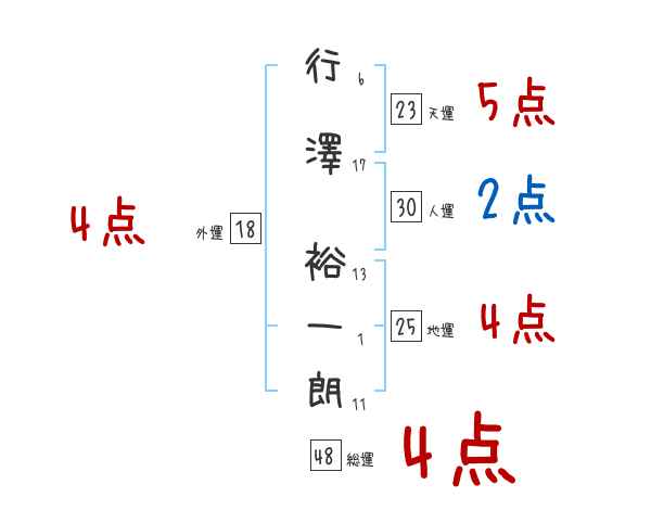 外運![]() | 行澤裕一朗さんの外運は18画の4つ星!情熱的で剛気。忍耐力があり信頼される。 生活面を象徴する運勢です。外部から受ける影響力を表し、結婚運、家庭運や職場、環境への順応性を表します。 |