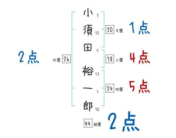 総運![]() | 小須田裕一郎さんの総運は44画の2つ星!誠実で慎重な性格。物事を考えすぎないように注意しましょう。 あなたの人生を表す1番重要な運勢です。生涯を通じて影響する総合運となり、主に50歳以降の晩年期に影響を及ぼします。 |