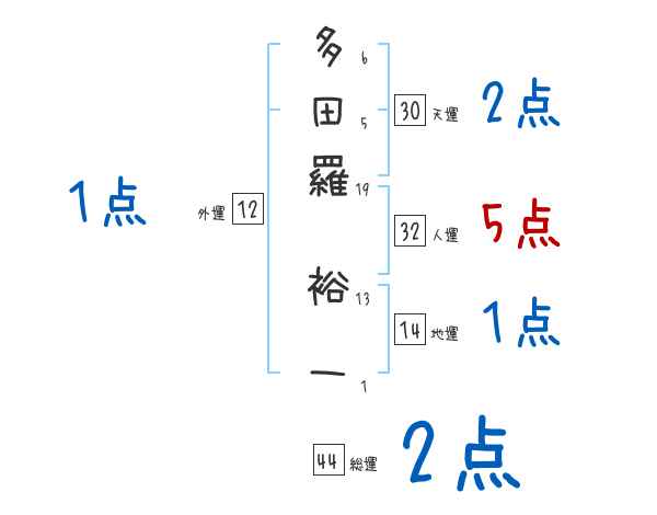 天運![]() | 多田羅裕一さんの天運は30画の2つ星!浮き沈みの激しさに注意しましょう。 家系が持つ宿命的な運勢を表します。祖先から受け継いだ苗字ですので自分の力が及びません。家柄を象徴します。 |