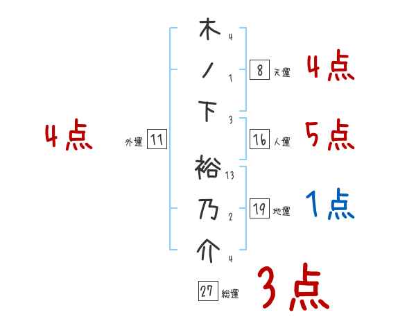 外運![]() | 木ノ下裕乃介さんの外運は11画の4つ星!着実に富や地位を得る幸運な人生。 生活面を象徴する運勢です。外部から受ける影響力を表し、結婚運、家庭運や職場、環境への順応性を表します。 |