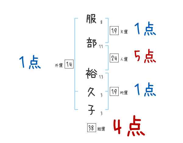 天運![]() | 服部裕久子さんの天運は19画の1つ星!優れた才能を持ちますが、協調性が足りないことも。周りの人と協力する事を意識しましょう。 家系が持つ宿命的な運勢を表します。祖先から受け継いだ苗字ですので自分の力が及びません。家柄を象徴します。 |