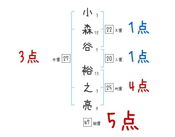 総運![]() | 小森谷裕之亮さんの総運は47画の5つ星!実力が開花し発展する円満な人生。財に恵まれる。 あなたの人生を表す1番重要な運勢です。生涯を通じて影響する総合運となり、主に50歳以降の晩年期に影響を及ぼします。 |