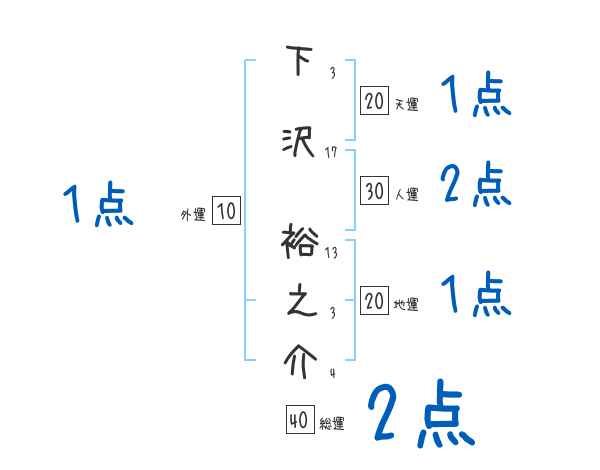 外運![]() | 下沢裕之介さんの外運は10画の1つ星!不安を感じやすい傾向。ストレスを抱えないように注意しましょう。 生活面を象徴する運勢です。外部から受ける影響力を表し、結婚運、家庭運や職場、環境への順応性を表します。 |