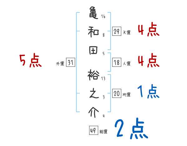 天運![]() | 亀和田裕之介さんの天運は29画の4つ星!完全主義で才能がある。厳格な心の持ち主。 家系が持つ宿命的な運勢を表します。祖先から受け継いだ苗字ですので自分の力が及びません。家柄を象徴します。 |