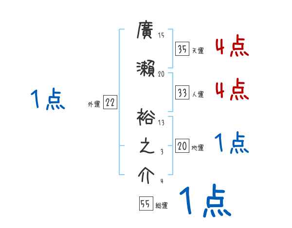 天運![]() | 廣瀨裕之介さんの天運は35画の4つ星!温厚な性格で感受性が高い。穏和な性格で人望が厚い。 家系が持つ宿命的な運勢を表します。祖先から受け継いだ苗字ですので自分の力が及びません。家柄を象徴します。 |