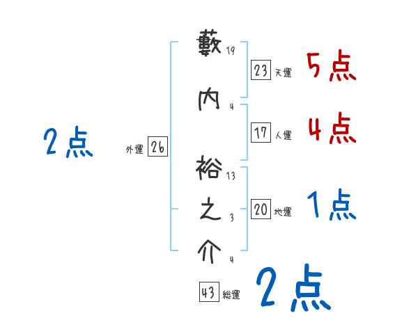 総運![]() | 藪内裕之介さんの総運は43画の2つ星!頑固な性格で独立心が強いかも。やや非現実的で浪費に注意しましょう。 あなたの人生を表す1番重要な運勢です。生涯を通じて影響する総合運となり、主に50歳以降の晩年期に影響を及ぼします。 |