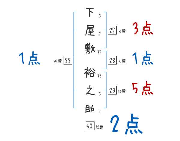 総運![]() | 下屋敷裕之助さんの総運は50画の2つ星!浮き沈みが激しく不安定。しりすぼみに衰退しやすいので注意しましょう。 あなたの人生を表す1番重要な運勢です。生涯を通じて影響する総合運となり、主に50歳以降の晩年期に影響を及ぼします。 |