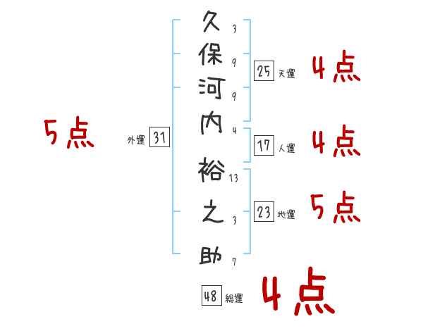 総運![]() | 久保河内裕之助さんの総運は48画の4つ星!賢明な性格で人望が厚い。指導力があり多くの人に尊敬される。 あなたの人生を表す1番重要な運勢です。生涯を通じて影響する総合運となり、主に50歳以降の晩年期に影響を及ぼします。 |
