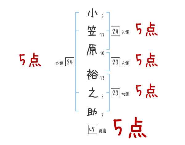 外運![]() | 小笠原裕之助さんの外運は24画の5つ星!家庭運が良く順調な人生。金運にも恵まれる。 生活面を象徴する運勢です。外部から受ける影響力を表し、結婚運、家庭運や職場、環境への順応性を表します。 |