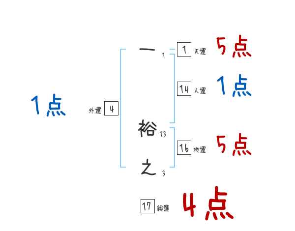 天運![]() | 一裕之さんの天運は1画の5つ星!行動力、指導力があり出世し繁栄する。幸運に恵まれる。 家系が持つ宿命的な運勢を表します。祖先から受け継いだ苗字ですので自分の力が及びません。家柄を象徴します。 |