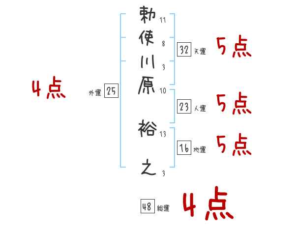 天運![]() | 勅使川原裕之さんの天運は32画の5つ星!柔軟性があり成功する。チャンスが多く金運が良い。 家系が持つ宿命的な運勢を表します。祖先から受け継いだ苗字ですので自分の力が及びません。家柄を象徴します。 |