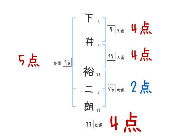 天運![]() | 下井裕二朗さんの天運は7画の4つ星!強い意志や信念を持ち独立心が強い。自立する。 家系が持つ宿命的な運勢を表します。祖先から受け継いだ苗字ですので自分の力が及びません。家柄を象徴します。 |