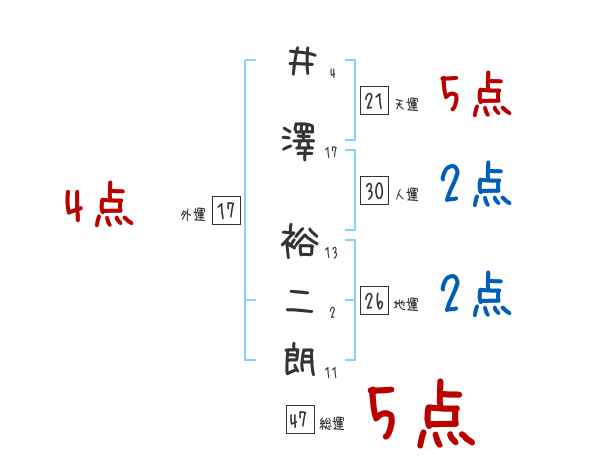 総運![]() | 井澤裕二朗さんの総運は47画の5つ星!実力が開花し発展する円満な人生。財に恵まれる。 あなたの人生を表す1番重要な運勢です。生涯を通じて影響する総合運となり、主に50歳以降の晩年期に影響を及ぼします。 |