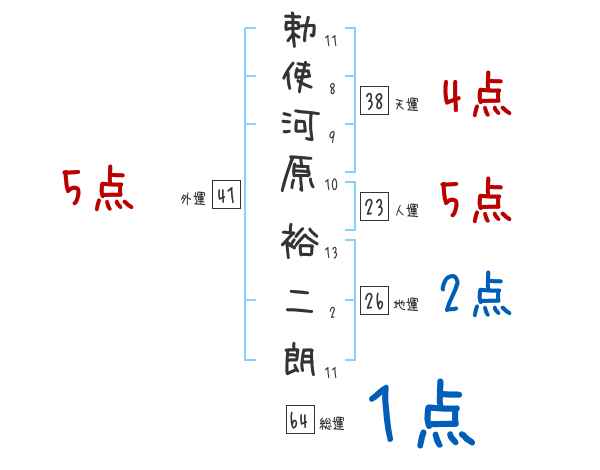 人運![]() | 勅使河原裕二朗さんの人運は23画の5つ星!想像力に優れ活力がある。一代で成功し名誉を手に入れる。 性格や才能などを表す2番目に重要な運勢です。人間関係や協調性、社会的な成功に影響します。主に20歳から50歳ぐらいまでの中年期の運勢を表します。 |