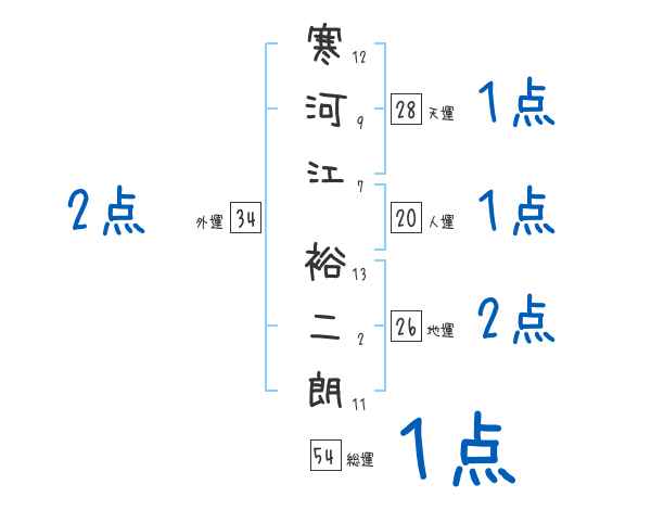 天運![]() | 寒河江裕二朗さんの天運は28画の1つ星!家庭環境に注意。スポーツで活躍できる能力があるかも。 家系が持つ宿命的な運勢を表します。祖先から受け継いだ苗字ですので自分の力が及びません。家柄を象徴します。 |