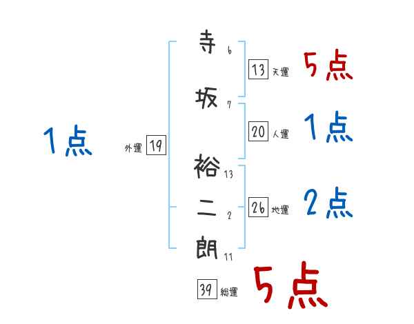 総運![]() | 寺坂裕二朗さんの総運は39画の5つ星!社交性に優れ人望が厚い。人の上に立ち成功する。 あなたの人生を表す1番重要な運勢です。生涯を通じて影響する総合運となり、主に50歳以降の晩年期に影響を及ぼします。 |