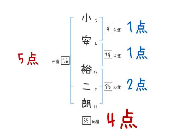 天運![]() | 小安裕二朗さんの天運は9画の1つ星!消極的で才能を発揮することが苦手なことも。周りの意見に耳を傾けましょう。 家系が持つ宿命的な運勢を表します。祖先から受け継いだ苗字ですので自分の力が及びません。家柄を象徴します。 |