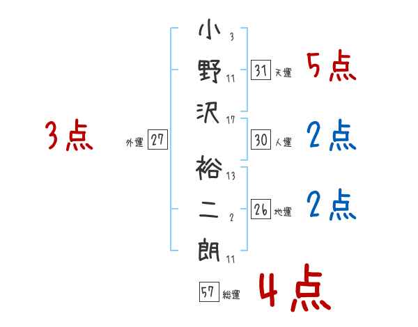 外運![]() | 小野沢裕二朗さんの外運は27画の3つ星!頭脳明晰だが強情で摩擦が多い傾向。孤立に注意。 生活面を象徴する運勢です。外部から受ける影響力を表し、結婚運、家庭運や職場、環境への順応性を表します。 |