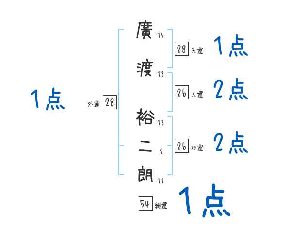 総運![]() | 廣渡裕二朗さんの総運は54画の1つ星!トラブルが多いかも。周りをよく見て協調して過ごしましょう。 あなたの人生を表す1番重要な運勢です。生涯を通じて影響する総合運となり、主に50歳以降の晩年期に影響を及ぼします。 |