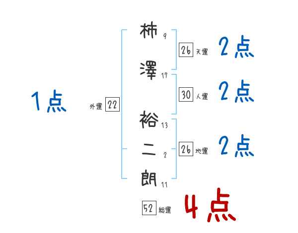 天運![]() | 柿澤裕二朗さんの天運は26画の2つ星!波瀾万丈かも。信頼できる人を大事にしましょう。 家系が持つ宿命的な運勢を表します。祖先から受け継いだ苗字ですので自分の力が及びません。家柄を象徴します。 |