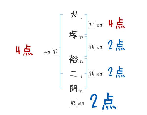 | 人運  | 犬塚裕二朗さんの人運は26画の2つ星!波瀾万丈かも。信頼できる人を大事にしましょう。性格や才能などを表す2番目に重要な運勢です。人間関係や協調性、社会的な成功に影響します。主に20歳から50歳ぐらいまでの中年期の運勢を表します。 |