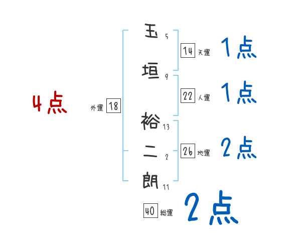 人運![]() | 玉垣裕二朗さんの人運は22画の1つ星!努力することが苦手ないっぽう手先が器用。芸術性にも優れる。 性格や才能などを表す2番目に重要な運勢です。人間関係や協調性、社会的な成功に影響します。主に20歳から50歳ぐらいまでの中年期の運勢を表します。 |