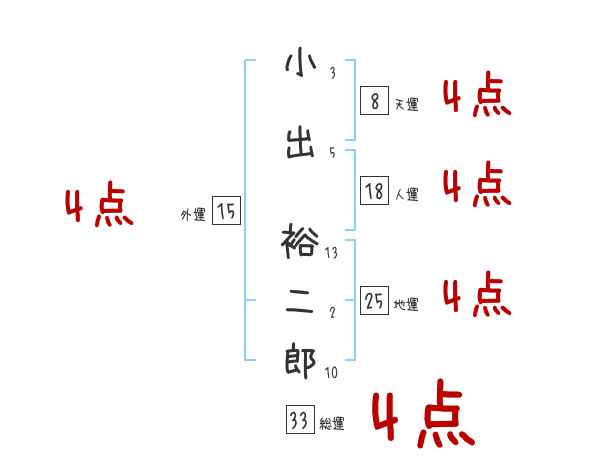 天運![]() | 小出裕二郎さんの天運は8画の4つ星!勤勉家。根気強く努力し成功する。忍耐力がある。 家系が持つ宿命的な運勢を表します。祖先から受け継いだ苗字ですので自分の力が及びません。家柄を象徴します。 |