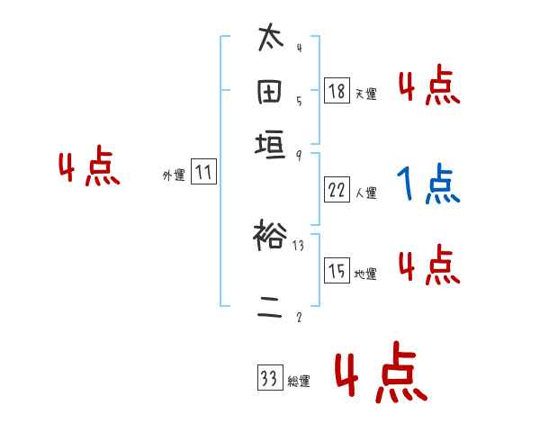 天運![]() | 太田垣裕二さんの天運は18画の4つ星!情熱的で剛気。忍耐力があり信頼される。 家系が持つ宿命的な運勢を表します。祖先から受け継いだ苗字ですので自分の力が及びません。家柄を象徴します。 |