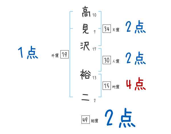 外運![]() | 高見沢裕二さんの外運は19画の1つ星!優れた才能を持ちますが、協調性が足りないことも。周りの人と協力する事を意識しましょう。 生活面を象徴する運勢です。外部から受ける影響力を表し、結婚運、家庭運や職場、環境への順応性を表します。 |