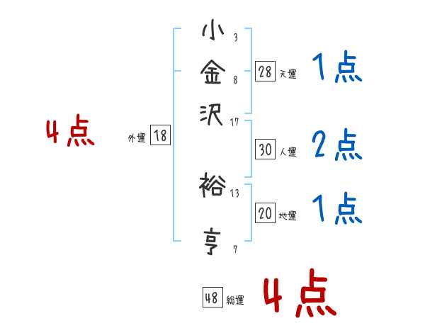 天運![]() | 小金沢裕亨さんの天運は28画の1つ星!家庭環境に注意。スポーツで活躍できる能力があるかも。 家系が持つ宿命的な運勢を表します。祖先から受け継いだ苗字ですので自分の力が及びません。家柄を象徴します。 |