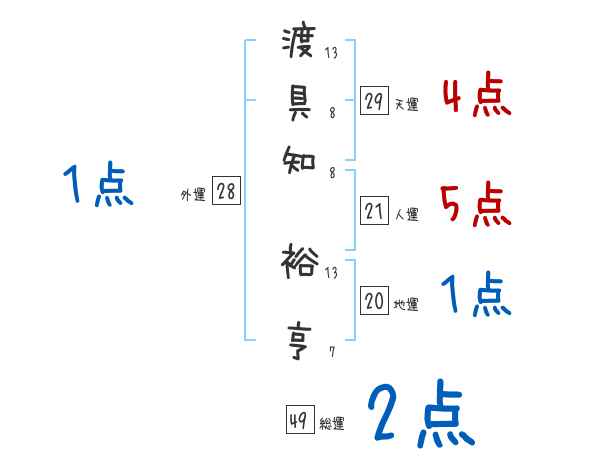 天運![]() | 渡具知裕亨さんの天運は29画の4つ星!完全主義で才能がある。厳格な心の持ち主。 家系が持つ宿命的な運勢を表します。祖先から受け継いだ苗字ですので自分の力が及びません。家柄を象徴します。 |