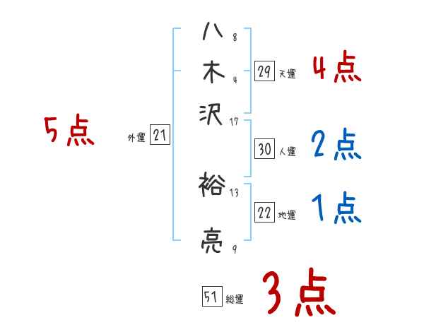 外運![]() | 八木沢裕亮さんの外運は21画の5つ星!統率力がある。独立し成功する。名誉を手に入れる。 生活面を象徴する運勢です。外部から受ける影響力を表し、結婚運、家庭運や職場、環境への順応性を表します。 |