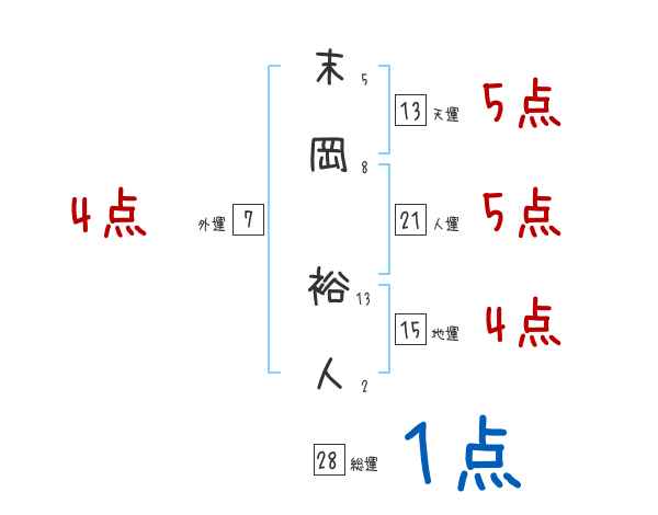 総運![]() | 末岡裕人さんの総運は28画の1つ星!家庭環境に注意。スポーツで活躍できる能力があるかも。 あなたの人生を表す1番重要な運勢です。生涯を通じて影響する総合運となり、主に50歳以降の晩年期に影響を及ぼします。 |