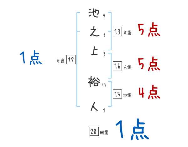 総運![]() | 池之上裕人さんの総運は28画の1つ星!家庭環境に注意。スポーツで活躍できる能力があるかも。 あなたの人生を表す1番重要な運勢です。生涯を通じて影響する総合運となり、主に50歳以降の晩年期に影響を及ぼします。 |