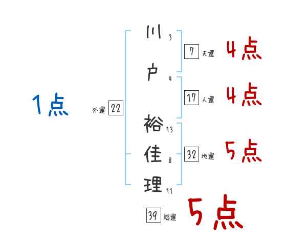 天運![]() | 川戸裕佳理さんの天運は7画の4つ星!強い意志や信念を持ち独立心が強い。自立する。 家系が持つ宿命的な運勢を表します。祖先から受け継いだ苗字ですので自分の力が及びません。家柄を象徴します。 |