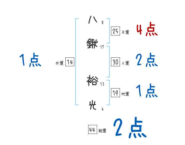 総運![]() | 八鍬裕光さんの総運は44画の2つ星!誠実で慎重な性格。物事を考えすぎないように注意しましょう。 あなたの人生を表す1番重要な運勢です。生涯を通じて影響する総合運となり、主に50歳以降の晩年期に影響を及ぼします。 |