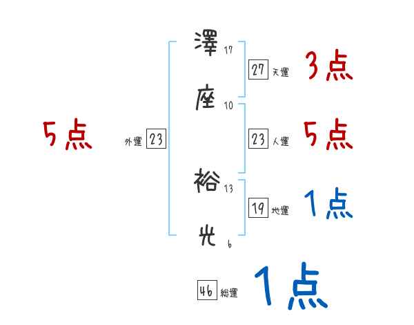 天運![]() | 澤座裕光さんの天運は27画の3つ星!頭脳明晰だが強情で摩擦が多い傾向。孤立に注意。 家系が持つ宿命的な運勢を表します。祖先から受け継いだ苗字ですので自分の力が及びません。家柄を象徴します。 |
