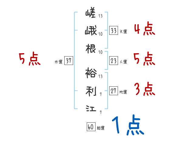 外運![]() | 嵯峨根裕利江さんの外運は37画の5つ星!努力家で順応性に優れる。現実的な考え方ができ忠実に物事をこなす。 生活面を象徴する運勢です。外部から受ける影響力を表し、結婚運、家庭運や職場、環境への順応性を表します。 |