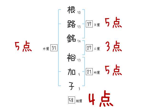 総運![]() | 根路銘裕加子さんの総運は58画の4つ星!安定した生活。大器晩成タイプ。 あなたの人生を表す1番重要な運勢です。生涯を通じて影響する総合運となり、主に50歳以降の晩年期に影響を及ぼします。 |