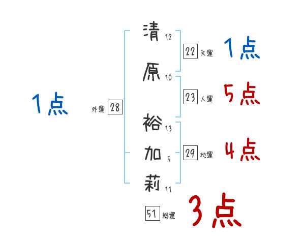 天運![]() | 清原裕加莉さんの天運は22画の1つ星!努力することが苦手ないっぽう手先が器用。芸術性にも優れる。 家系が持つ宿命的な運勢を表します。祖先から受け継いだ苗字ですので自分の力が及びません。家柄を象徴します。 |